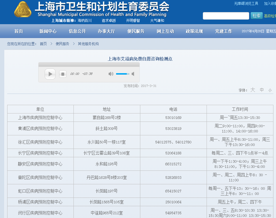 比如搜索「上海市艾滋病收费自愿咨询监测点」,就能找到上海各个区的监测点位置、联络方式、开放时间等等。