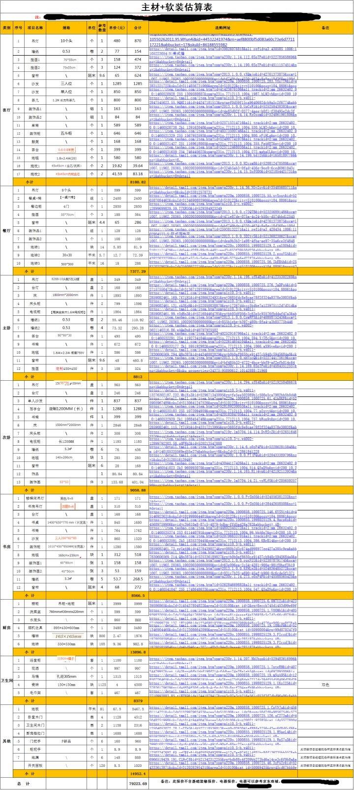 2、第二阶段:细化设计图纸。大少数找装修公司的客户都会超预算,缘由就是由于设计的不专业和不详尽,所以在施工阶段才会被浑水摸鱼(就是增项多啦)。假设设计阶段做到设计详尽和专业,施工按图施工就可以了,普通是不会超预算的。设计师把主材+软装的尺寸、数量、材质、淘宝参考链接、淘宝参考价钱等等都会详细的罗列出来,加上人工费+辅料,加上电器就是总预算了。