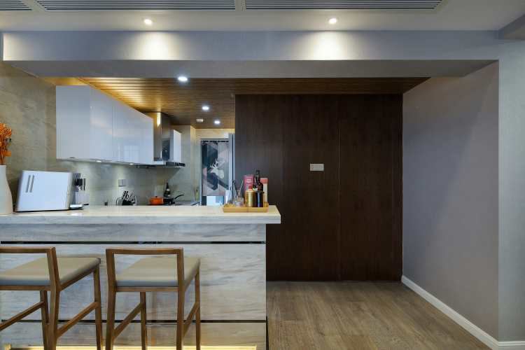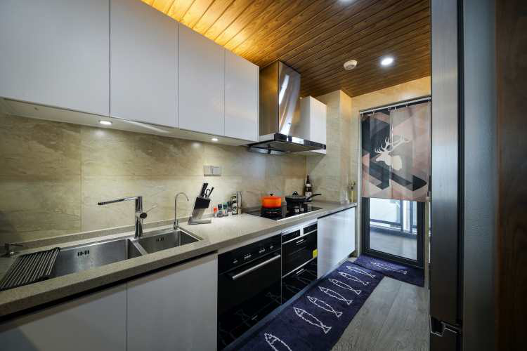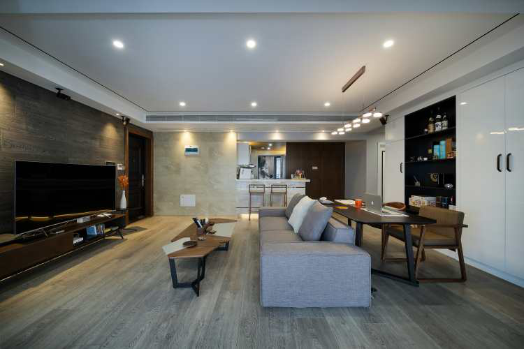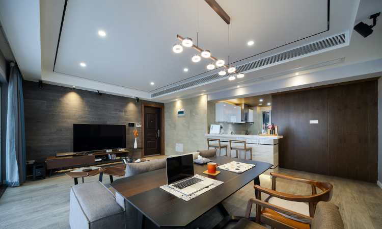 墙面与顶面+电视柜的原木色原木色,黑色色的花砖与全体黑色色的基调照应。厨房的细框门与复杂线条的餐椅