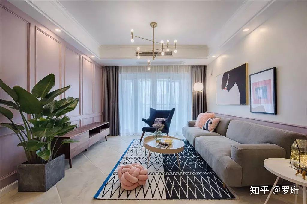 金色物件与粉色物件搭配,一面全墙石膏线+半墙石膏线,家具全部采用细腿,亚麻地毯+灰色布艺沙发。原木色+粉色的百搭款。