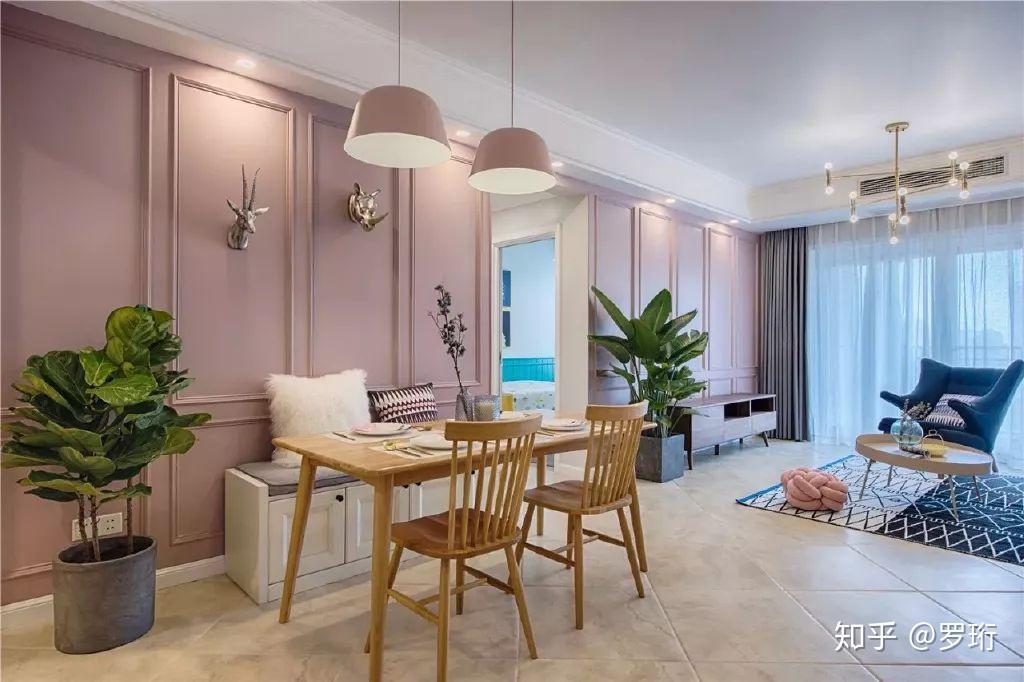 石膏线+卡座柜体门照应,金色吊灯+金色落地照应,粉色抱枕+粉矮墩+粉色墙面+粉色吊灯,细脚茶几+细脚边几