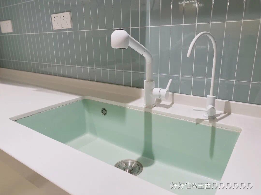 水池用了薄荷绿的石英石款,沉是真沉,普通厂商都建议做成台上盆。但只需不妥协,手艺到了,做好加固,台下盆无压力。