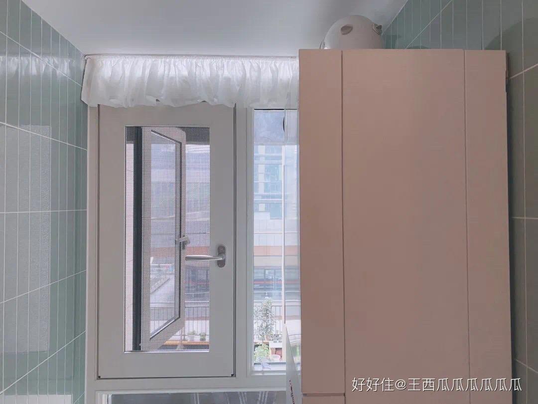 定做了一条布帘,遮一遮显露半截的玻璃。之前装置窗户的厂商不仔细,玻璃胶抹得乌七八糟,干脆一遮了之。